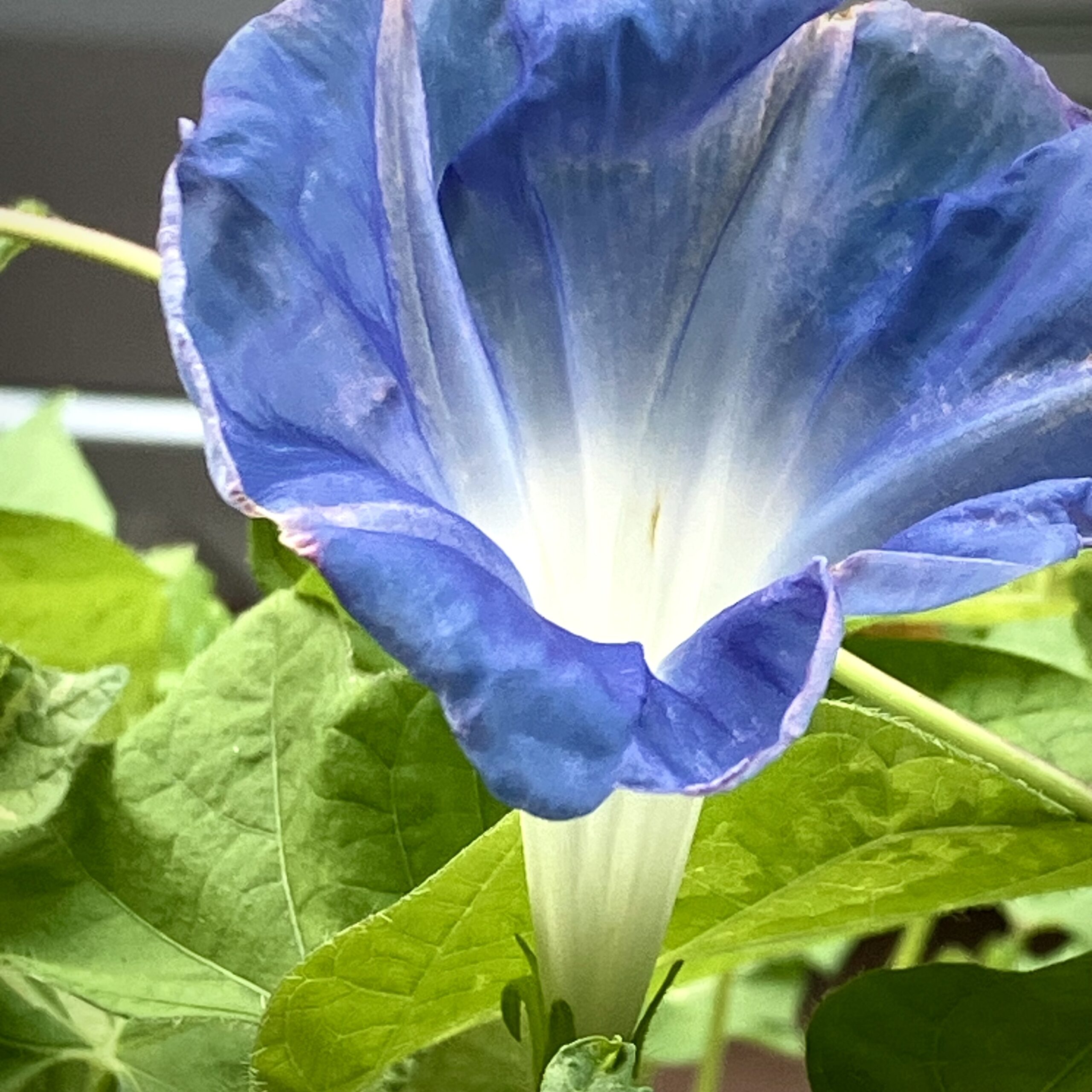 今朝、いつものようにベランダに出て、あさがおの鉢に目をやった瞬間、思わず「おおっ」と声が出てしまった。そこには、蕾があるのも気がつかなかったが、見事に一輪、花を咲かせていたのだ。淡い青色の花びらが朝の