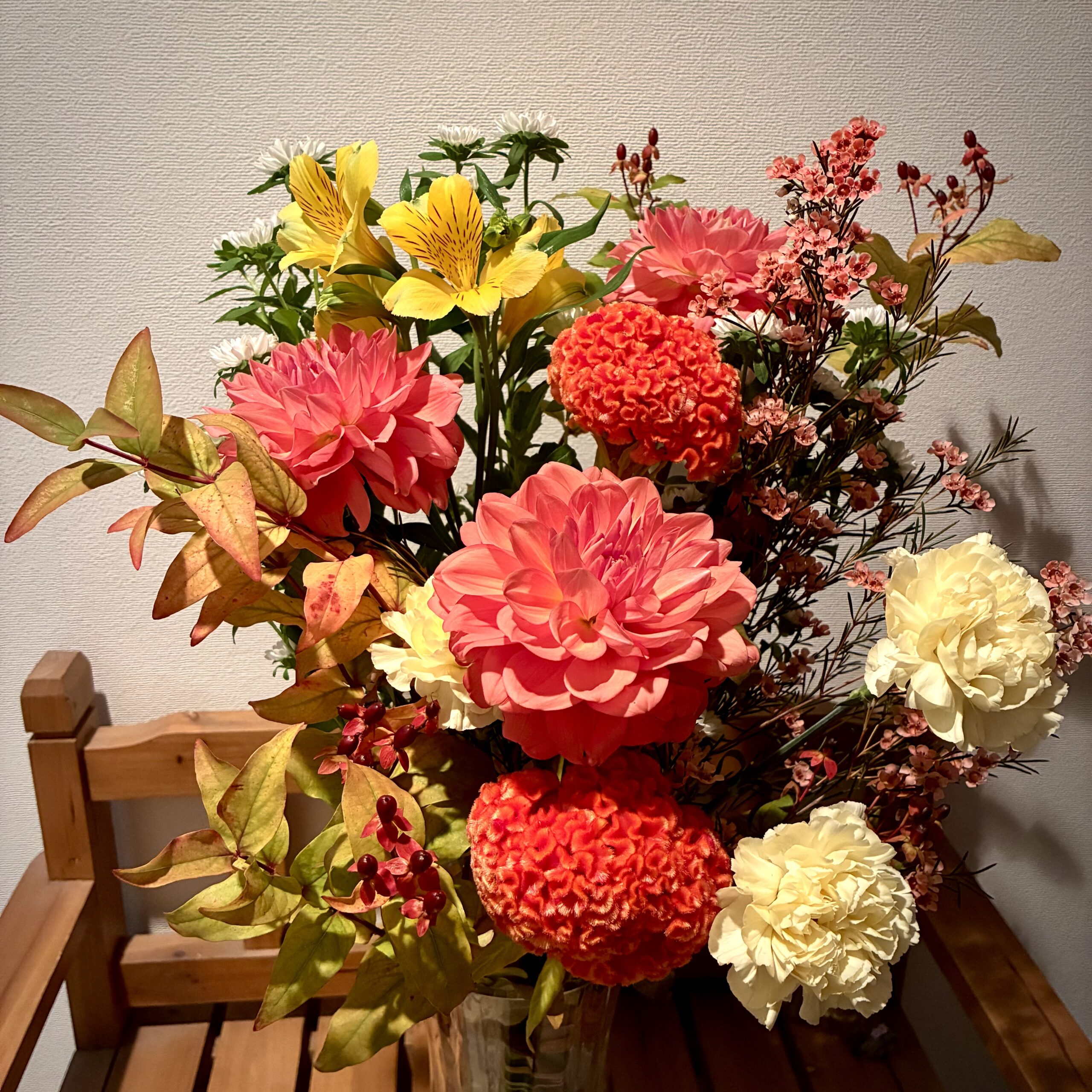 秋になると、空気がひんやりとしてきて、街の木々も少しずつ色づき始めますよね。そんな季節にぴったりなのが、秋の花束。特に、紅葉ヒペリカム、ダリア、ケイトウ、ワックスフラワー、アスターを組み合わせた花束は